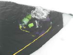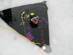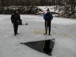 und Säge ein dreieckiges Loch in die etwa 12 cm dicke Eisdecke gemacht
