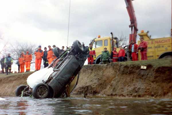 Bergung von Auto-Wracks aus dem Naturbad Nordost (Bagger) in Leipzig/Thekla Mit langen Stahlseilen werden die Reste des Auto-Wracks ans Ufer gezogen. zurück
