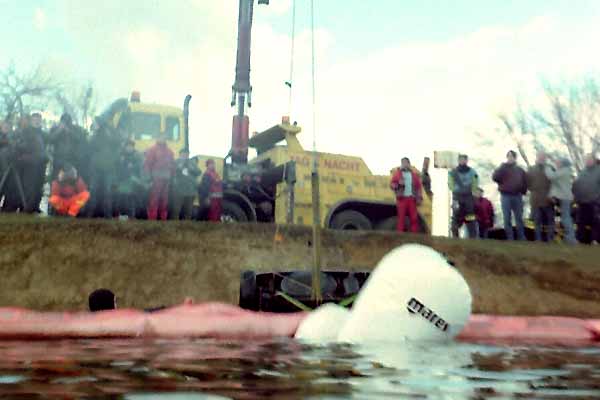 Mit den beiden luftgefüllten Hebesäcken werden die in Ruhe geglaubten Stahlkollosse in die Nähe des Uferbereiches gebracht, wo ein mächtiger Autokran am Rand des Sees einen sicheren Halt gefunden hat. Trotz zwei Hebeschirme mit je ca.500 kg Auftrieb hat der Mazda 626 mit einem Gewicht von über einer Tonne so einen Tiefgang, daß man ihn schwimmend nur bis in eine Wassertiefe von 4 bis 5 Meter brachte, von dort wird dann ein langes Stahlseil am Kran befestigt.