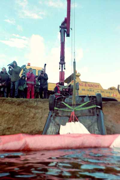 Bergung von Auto-Wracks aus dem Naturbad Nordost (Bagger) in Leipzig/Thekla Endlich, nun hängt der Mazda 626 nach mehreren Hebeversuchen, zur Freude Aller, am Haken. zurück