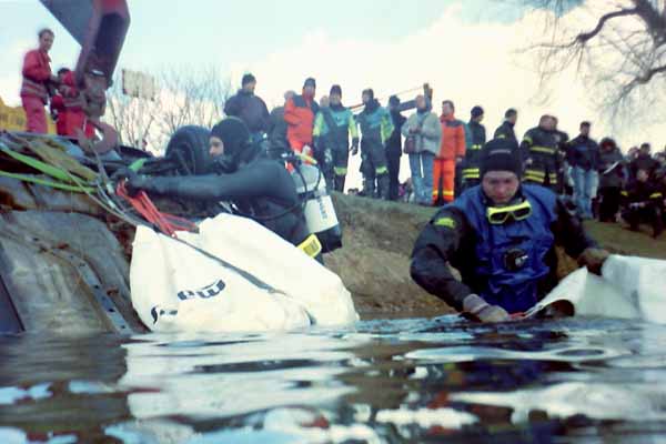 Letzte Prüfungen von den Tauchern auf ein sicheres Anschlagen. Trotz Temperaturen um den Gefrierpunkt, kaltem Wind und Schneetreiben, müssen die Seile mit den halberfrorenen Händen sicher eingehangen werden.