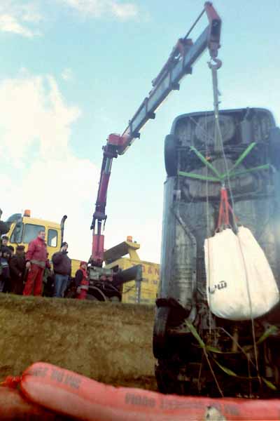 Bergung von Auto-Wracks aus dem Naturbad Nordost (Bagger) in Leipzig/Thekla Mit Hilfe der Feuerwehr und dem Einsatz einer Ölsperre kann größerer Schaden durch freiwerdende Öl- und Benzinreste weitgehend verhindert werden. zurück