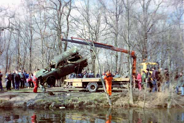 Bergung von Auto-Wracks aus dem Naturbad Nordost (Bagger) in Leipzig/Thekla Einmal umgehangen läd sich der Abschleppwagen die Trabbi-Reste auf. zurück