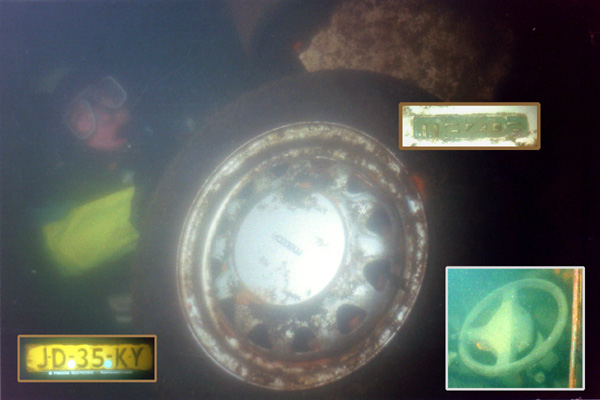Bergung von Auto-Wracks aus dem Naturbad Nordost (Bagger) in Leipzig/Thekla Unterwasseraufnahmen von einem Mazda 626 in 9 Meter Tiefe und einer Sichtweite unter 0,5 Meter. Nummernschild und Automarke sind noch gut zu erkennen. zurück