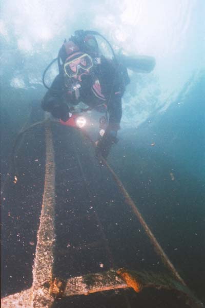 Der Steinbruch Prelle hat gute Sichtweiten und ist sehr fischreich. Reste von der ehemaligen Bewirtschaftung, wie die alte Eisenleiter im Hintergrund, sind noch vorhanden.
