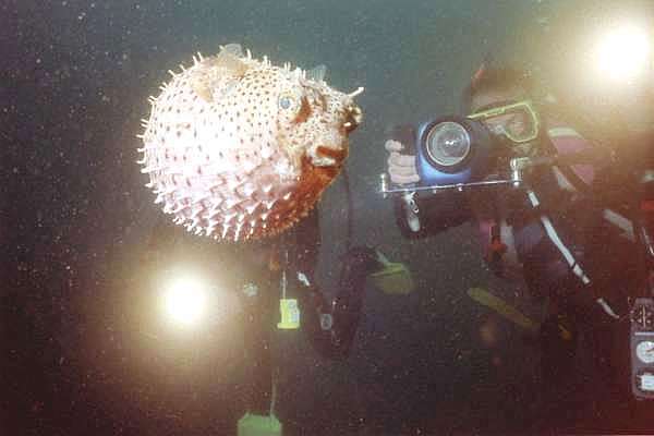 Ein Igelfisch etwas erregt vom hellen Scheinwerferlicht.