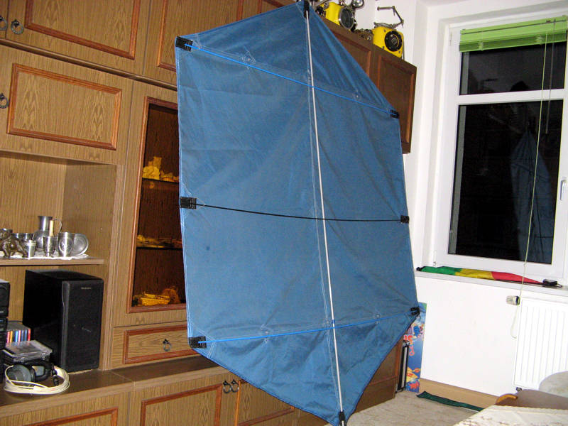 Der Rokkaku aus Ballonstoff fertig genäht (90g/m) und aufgespannt. Höhe = 208cm, Breite = 155cm entspricht ca. 3,2qm. |