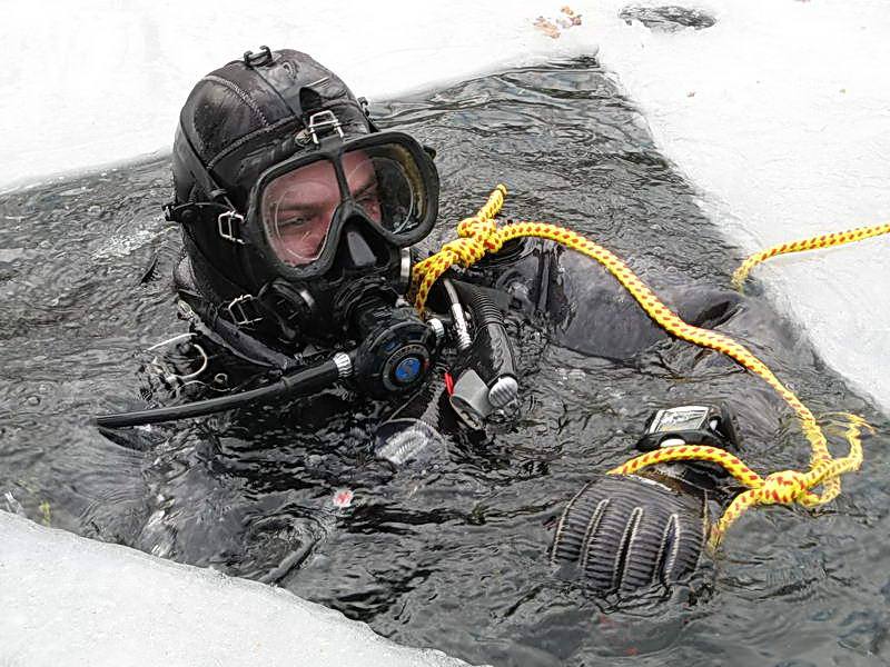 Taucher mit Vollgesichtsmaske im Eisloch.