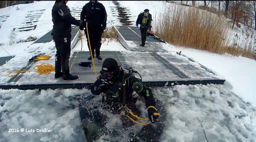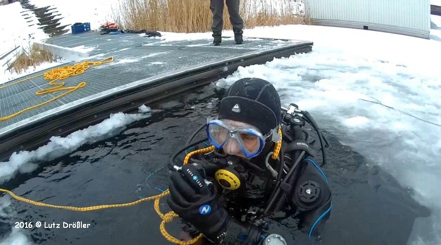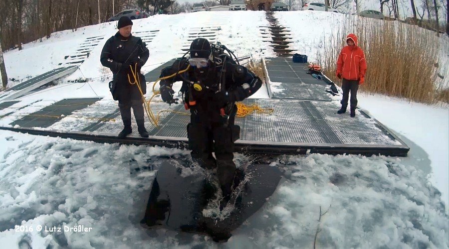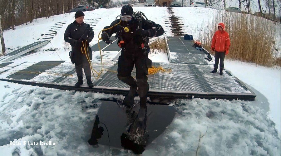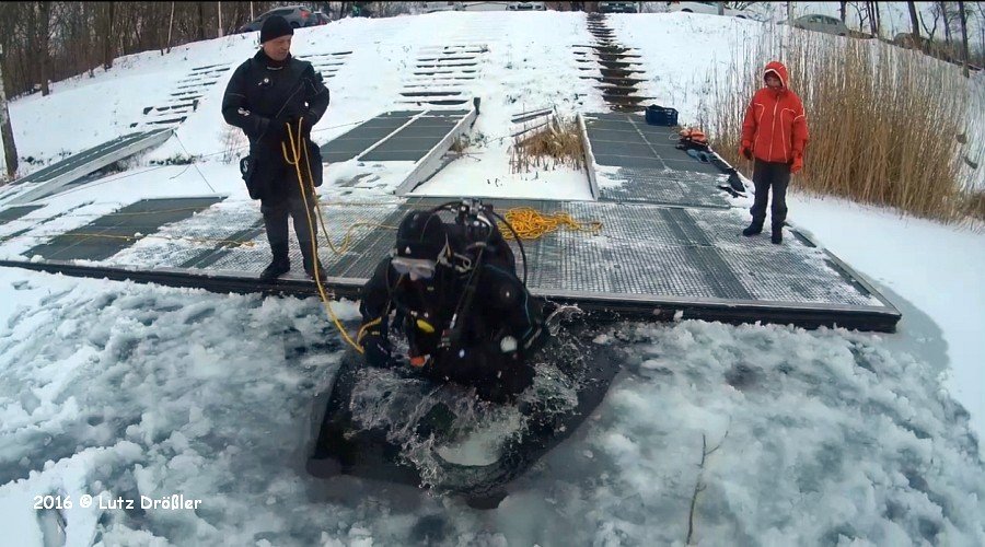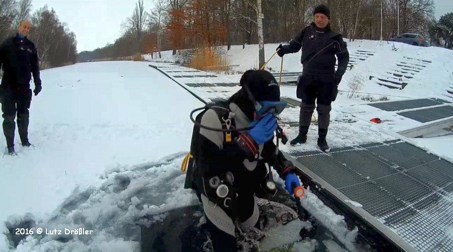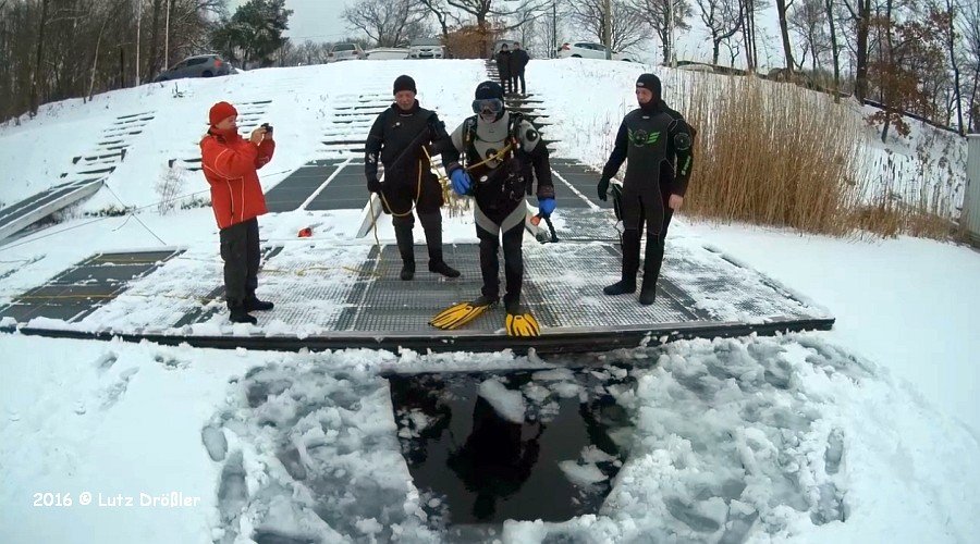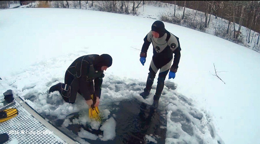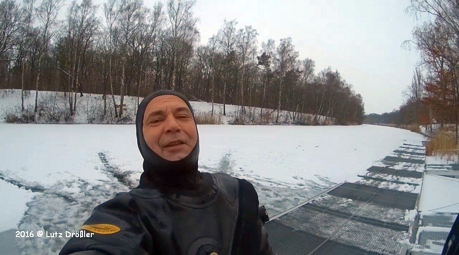 Eistauchen am verschneiten Elster-Saale-Kanal in Burghausen am 16. Januar 2016