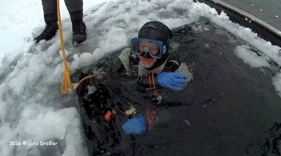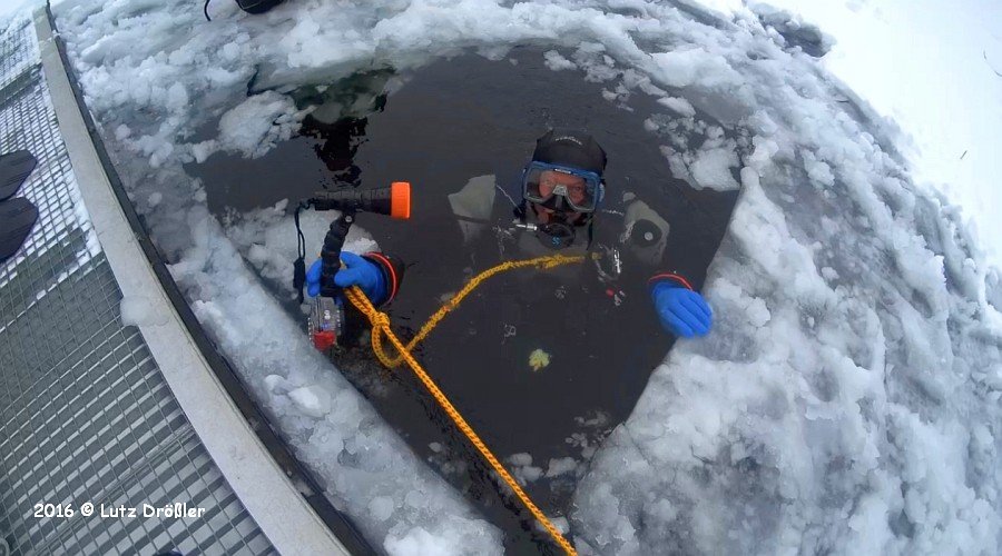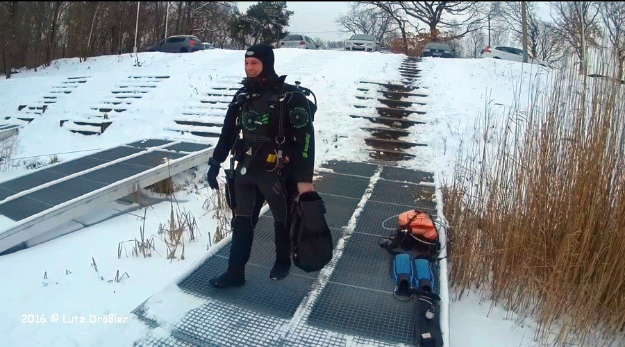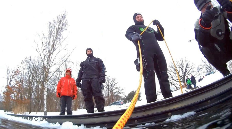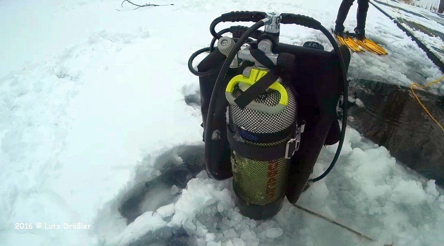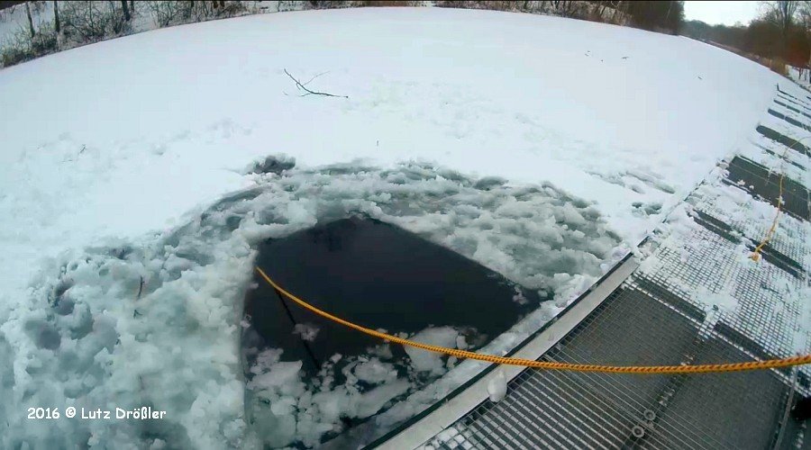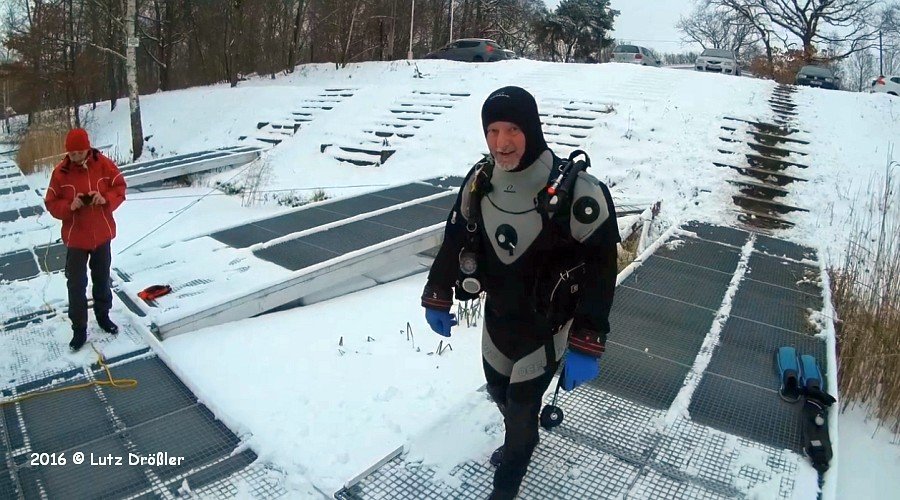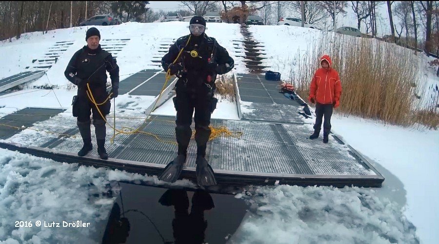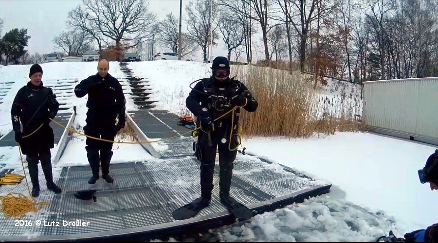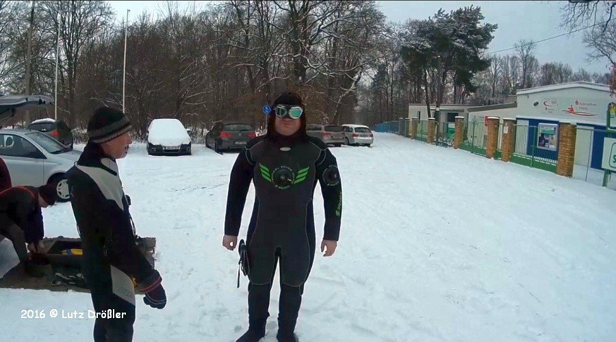 Eistauchen am verschneiten Elster-Saale-Kanal in Burghausen am 16. Januar 2016