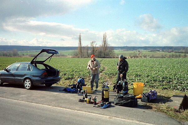 haben, hier in voller Tauchausrüstung übers Feld zu laufen.