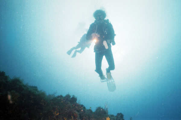 Schwebende Taucher über der Riffkante .