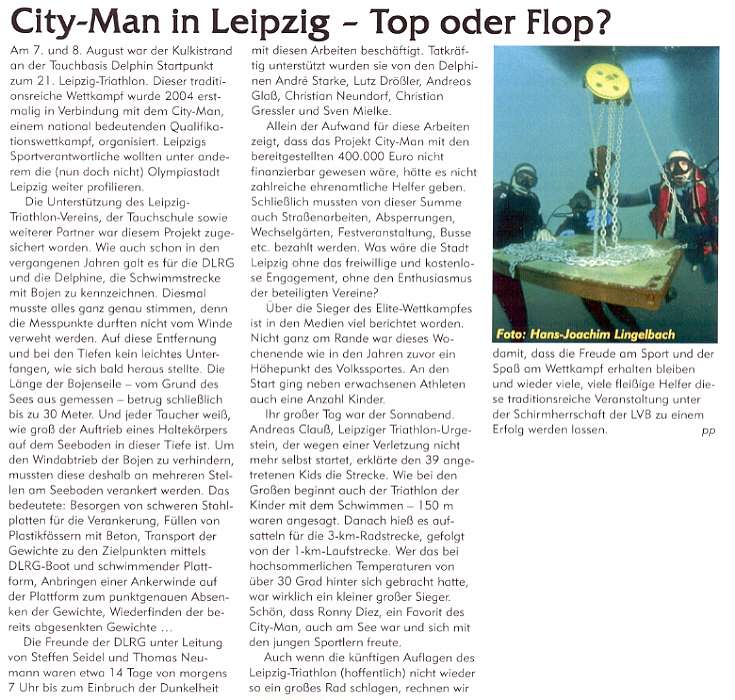 Die Leipziger DLRG baut zusammen mit den Leipziger Delphinen eine neuen Triathlonstrecke im Kulkwitzer See. Am 7./8. Juli, zum diesjährigem 21. Leipziger Triathlon ( City-Man), wird nicht nur einfach hin und her geschwommen, sondern es gibt einen neu vermessenen Viereck-Kurs. Auch werden die Wendepunkte mit deutlich größeren Bojen versehen.