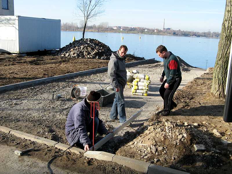 Setzen der Bordesteine für den befestigten Einstiegweg zum See.