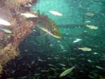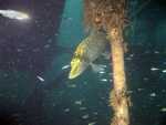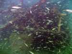 kleine Fische die Plattform und suchten Schutz in dem angebrachten Reisigästen.