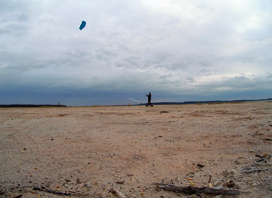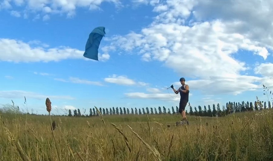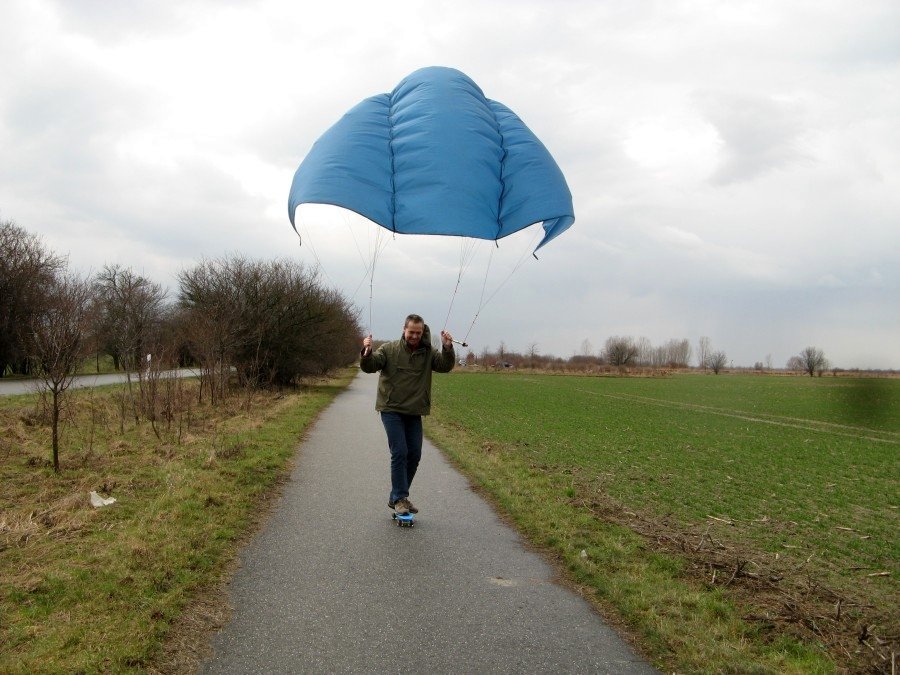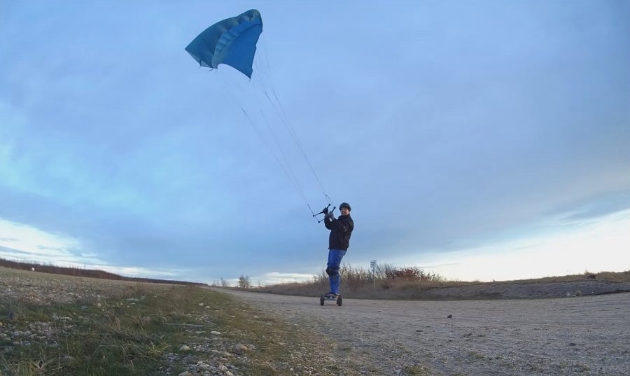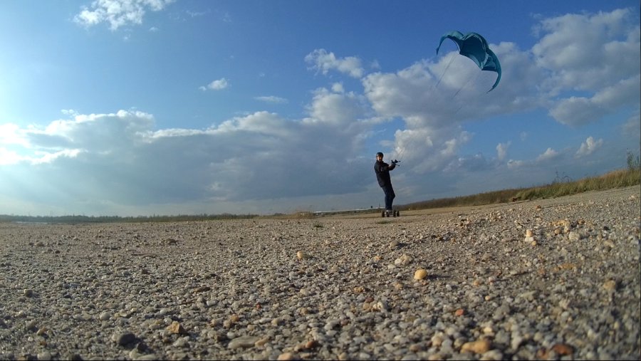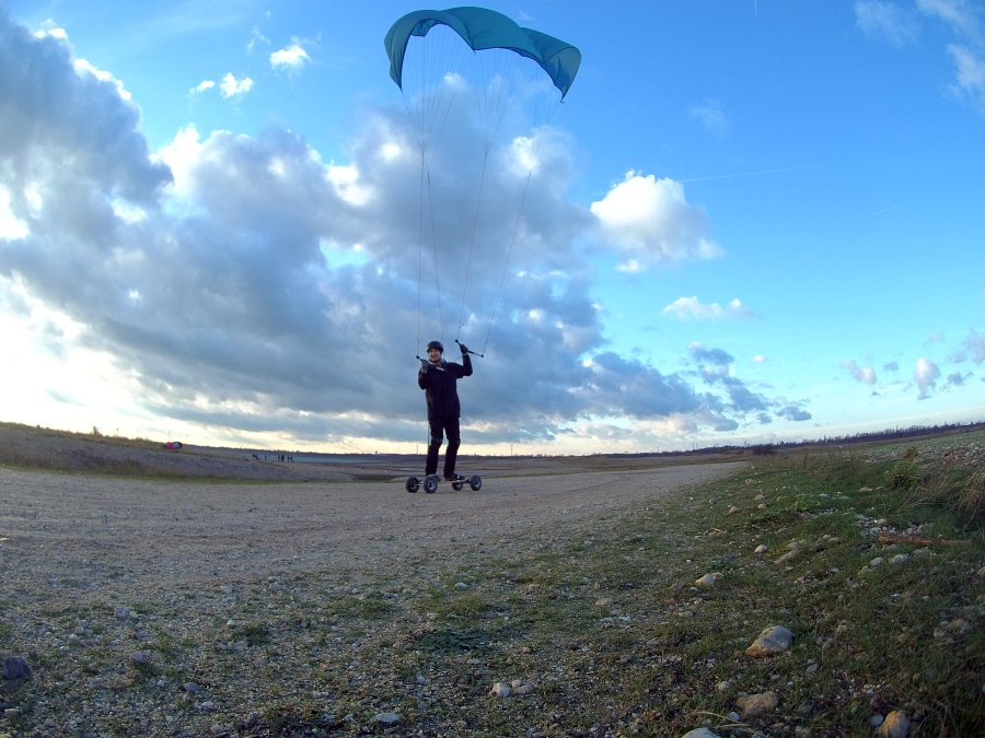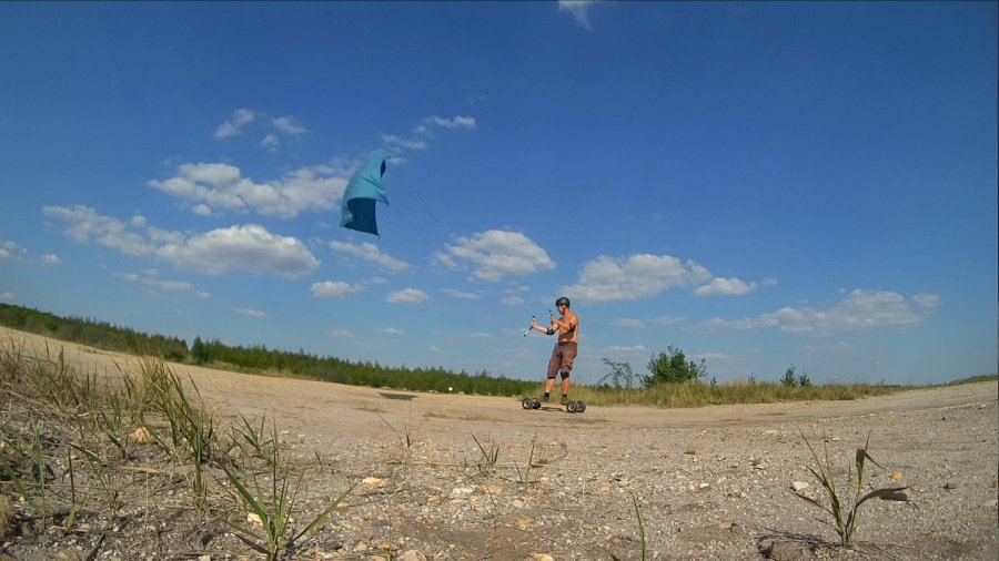 mit einem Skateboard oder Mountainboard, einem Kite und der Kraft des Windes