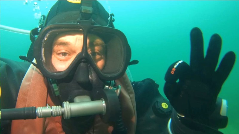 Vollgesichts-Maske von Scubapro mit Poseidon 5000-Atemregler und Oberflächenventil im Einsatz.